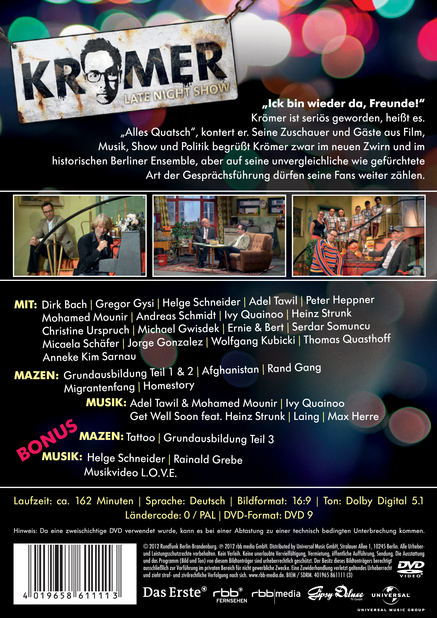 Diese DVD enthält ein 76 minütiges Best of aus den acht Sendungen „Krömer – Late Night Show“ mit den besten Auftritten von Krömer und seinen Gästen. Zudem wurden die Musikacts in ca. 15 Minuten zusammengefasst und es können 55 Minuten der Mazen noch einmal genossen werden. Und wer dann noch nicht genug hat, schaut sich die 17 Minuten ungesendetes Material als Bonus an.