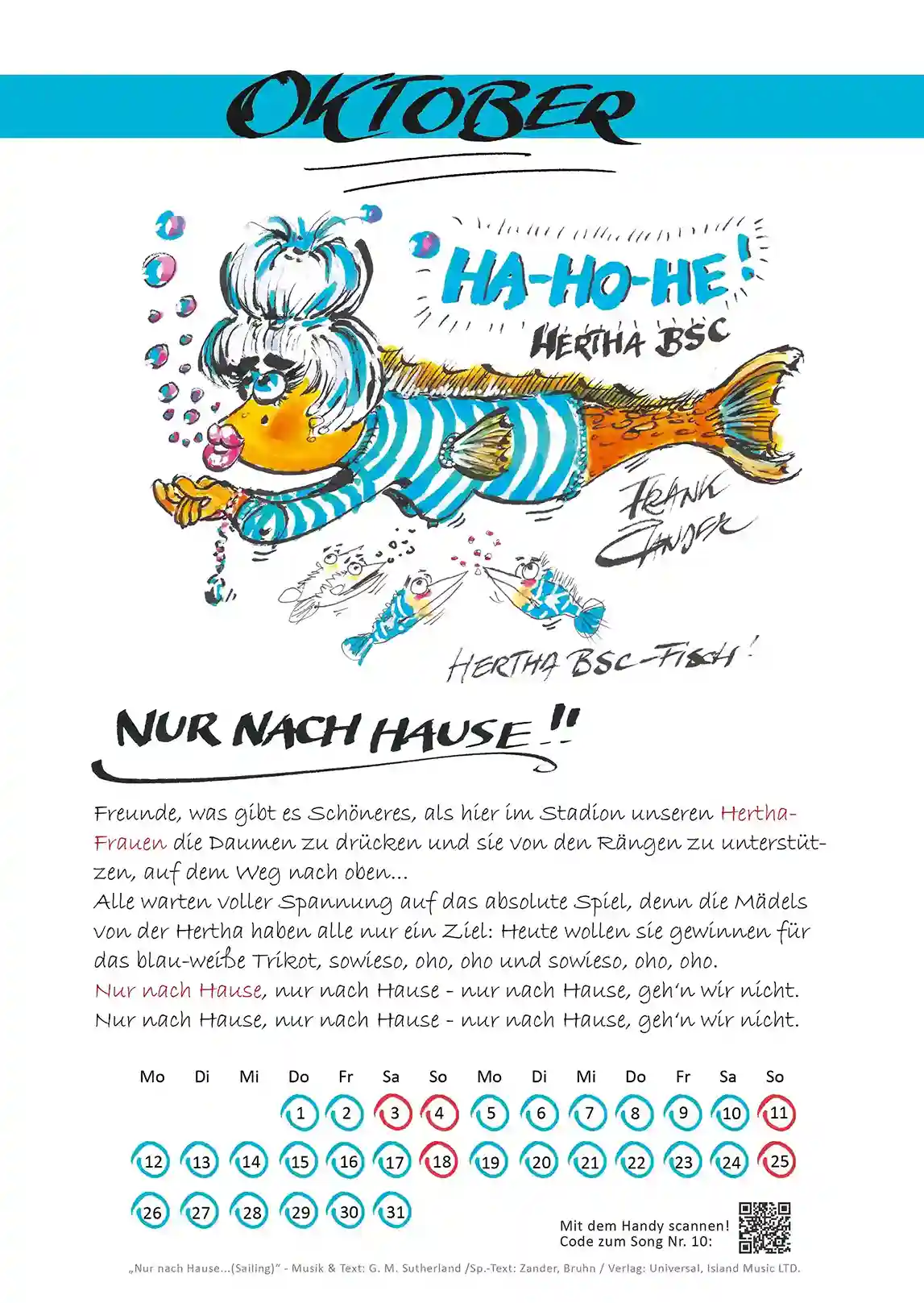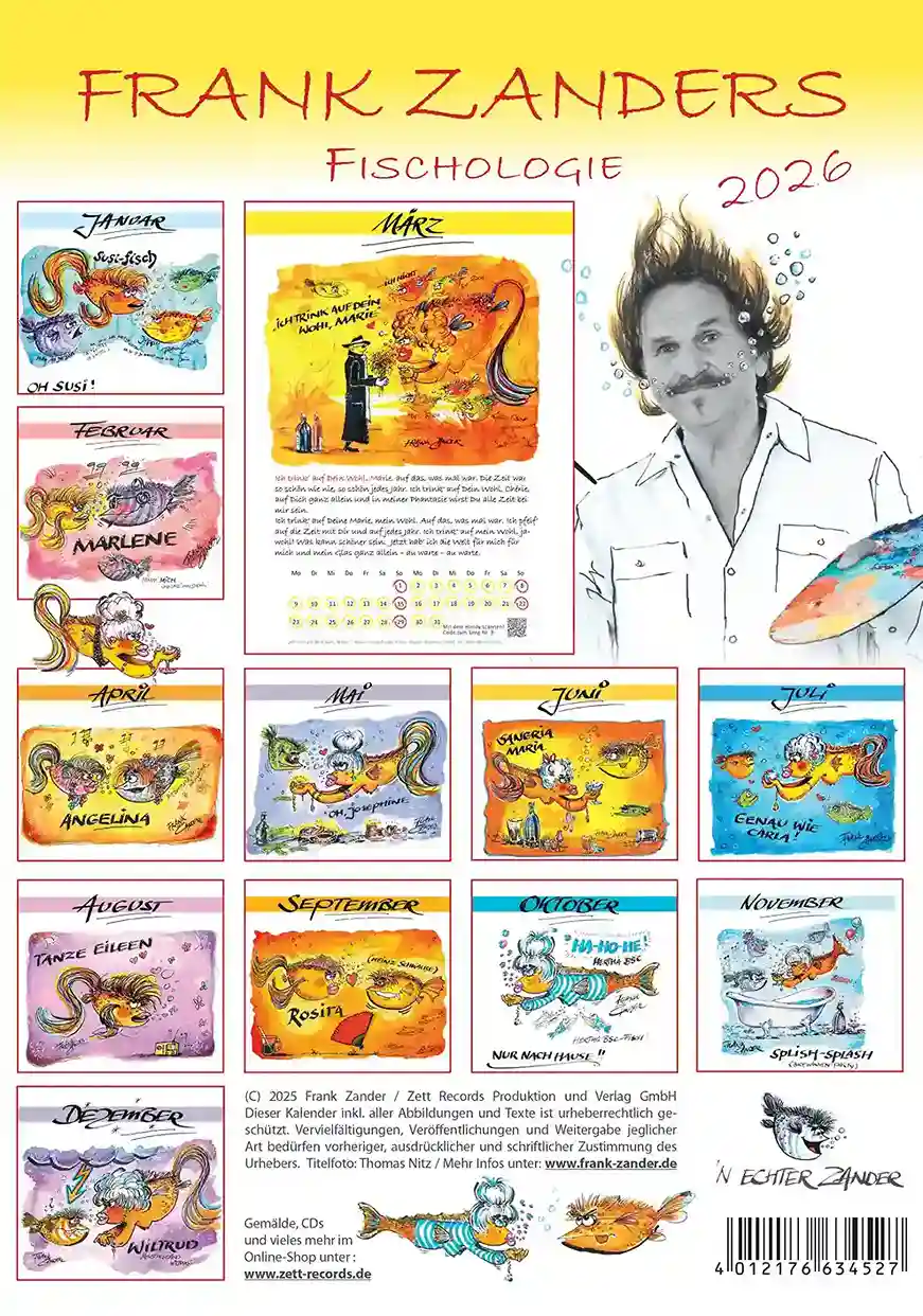 Ab sofort gibt es Frank Zanders Fischologie Wandkalender 2026 mit zwölf Fischen, die sich alle um die musikalischen Frauengeschichten des Berliner Kultkünstlers drehen. Wir treffen z.B. den „Oh Susi“-Fisch, trinken auf das Wohl von Marie, feiern mit Marlene und singen mit der alten Dame Hertha – die Frauenfassung der Fußball-Vereinshymne „Nur Nach Hause…“ von Hertha BSC. Jeder Fisch ist ein echter Hit aus Zanders langjähriger Karriere.
