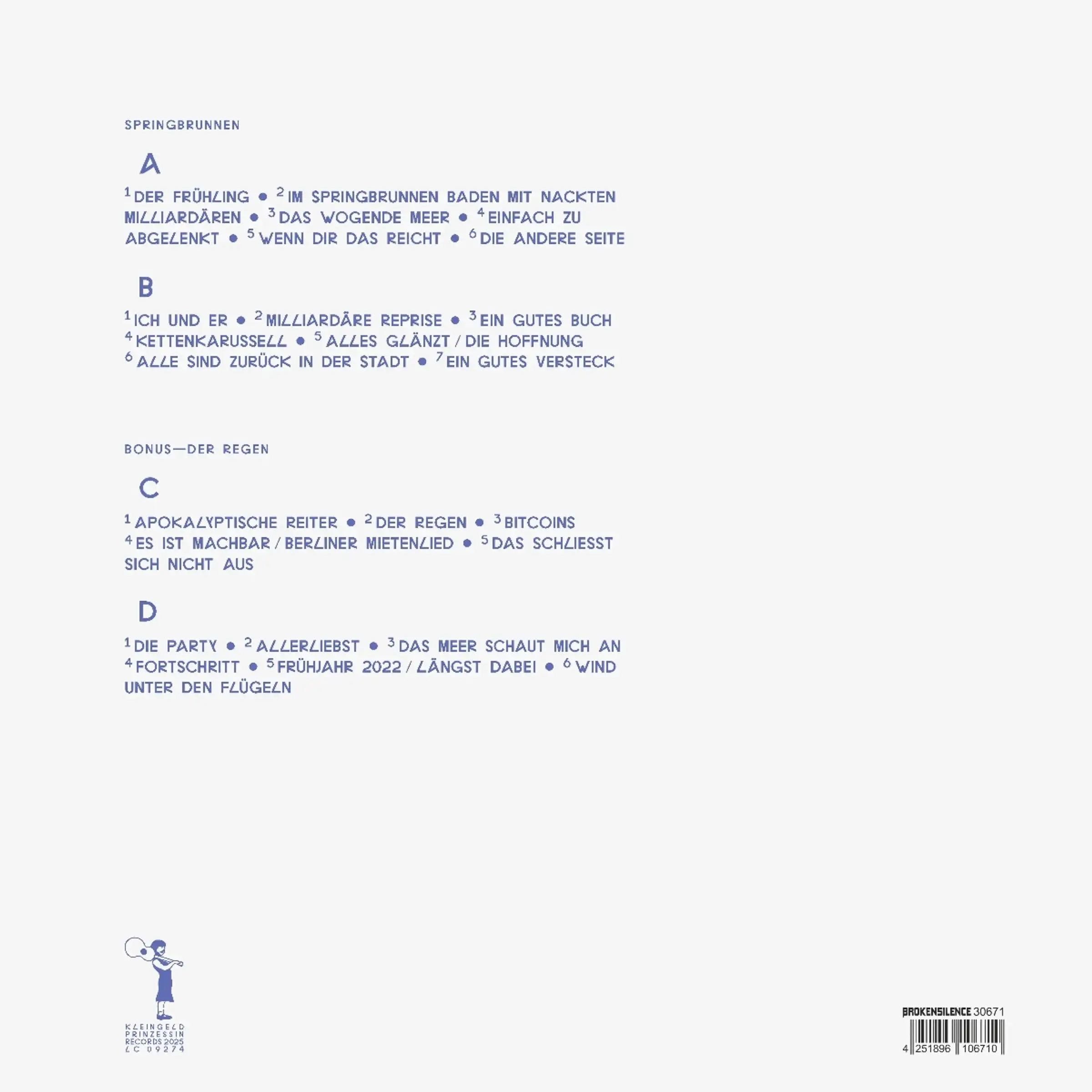 Die 2‑LP Springbrunnen von Dota (Dota Kehr) entführt Sie in ein atmosphärisches Klangreich aus behutsam erzählten Alltagsgeschichten und feinen Melodien. Zwischen Pop, Indie und Folk spannt sich ein musikalisches Netz, in dem jede Zeile berührt.