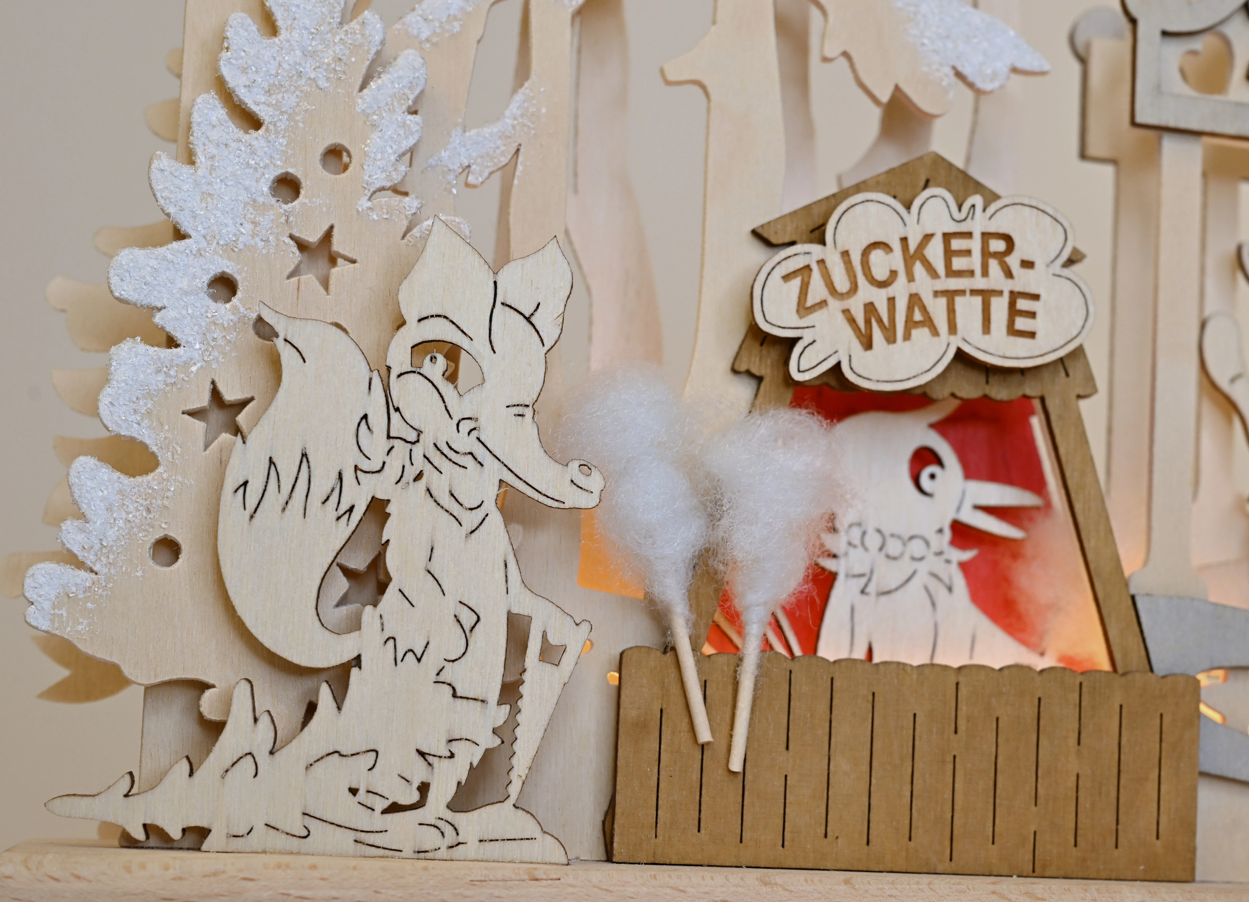 Dieser hochwertige, mit LED beleuchteter Schwibbogen, der aus insgesamt 48 einzelnen Buchen- sowie Birkenholz-Teilen besteht, greift thematisch einen Jahrmarkt im verschneiten Märchenwald auf, den das Sandmännchen mit einem Heißluftballon besucht.